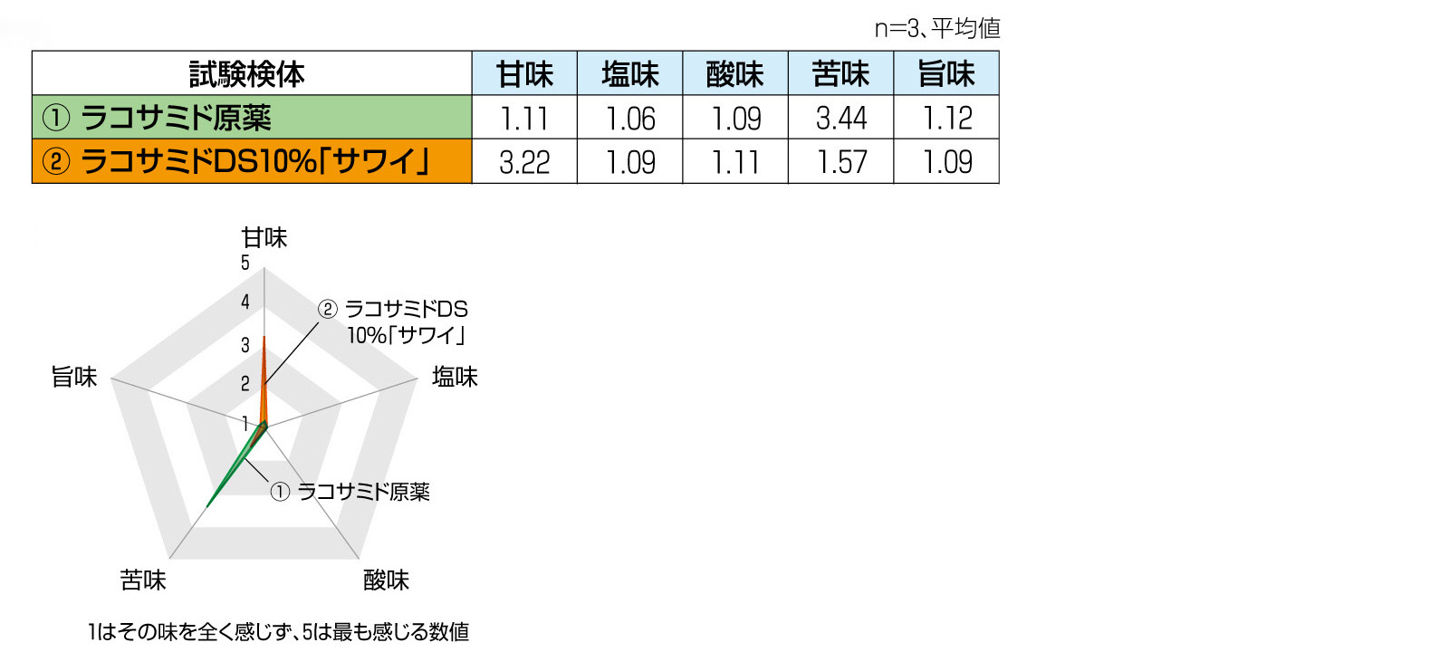 TASTEYE®を使用した試験の結果、ラコサミド原薬に対してラコサミドDS10%「サワイ」は苦味のスコアが1.87低下し、甘味のスコアが2.11増加しました。塩味、酸味、旨味のスコアはそれぞれ0.1以下の変化でした。